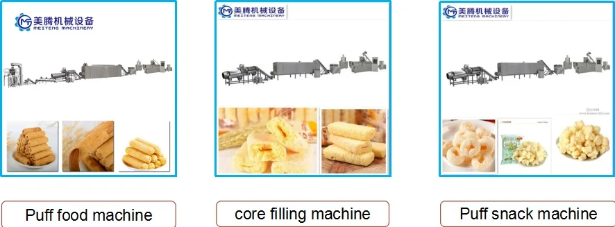 usvojite kukuruz, pirinač, pšenicu, zob, ječam itd. kao sastojke za pripremu napuhane grickalice. Trenjem puža i bureta zrna se kuvaju u ekstruderu. Formiranje se vrši na rezaču. Oblik proizvoda je određen kombinacijom otvora matrice, uključujući kuglicu, cijev, štap, prsten, voćnu petlju, zvijezdu, točak i cvijet itd.